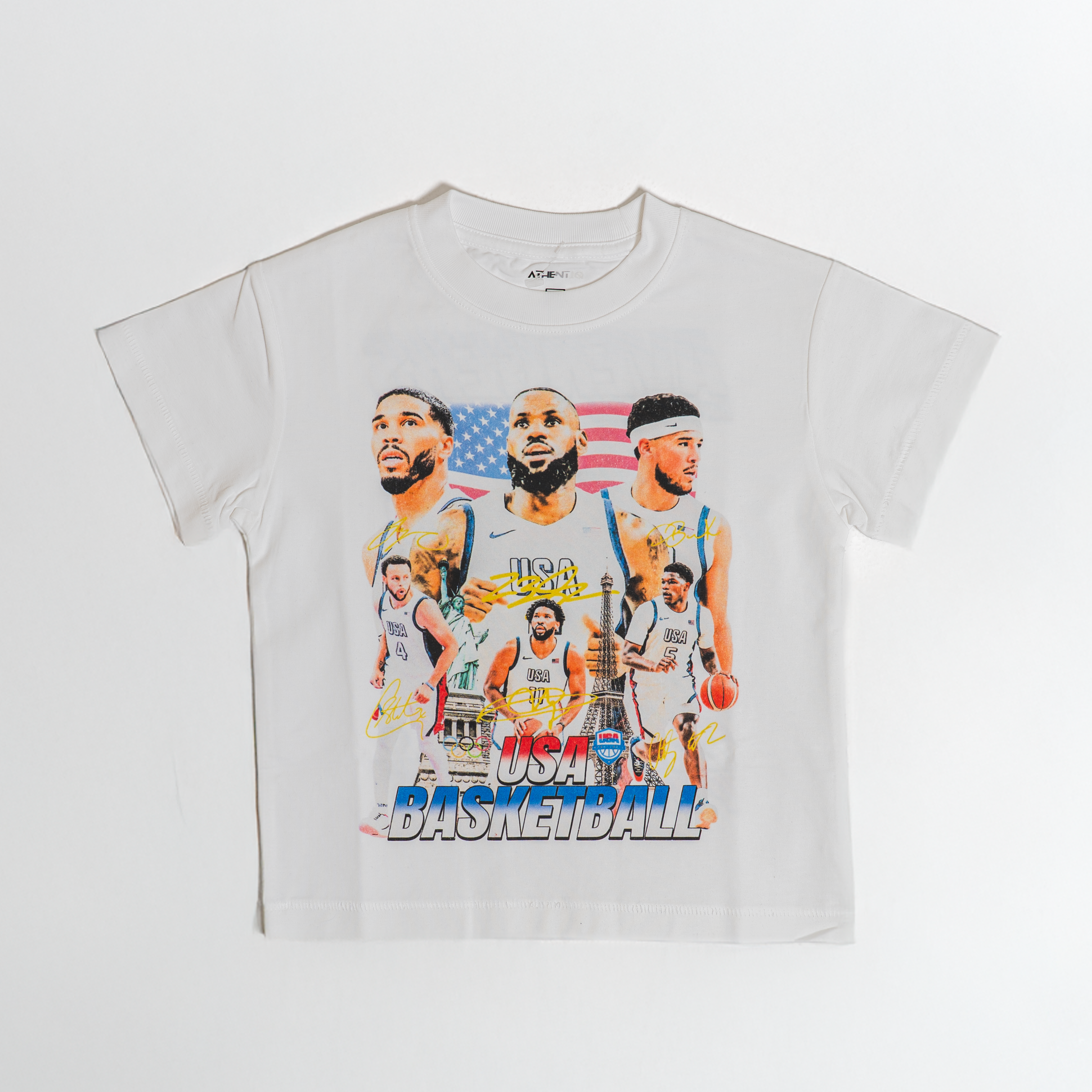 This white cartoon T-shirt showcases iconic faces inspired by the best USA basketball players of all time.